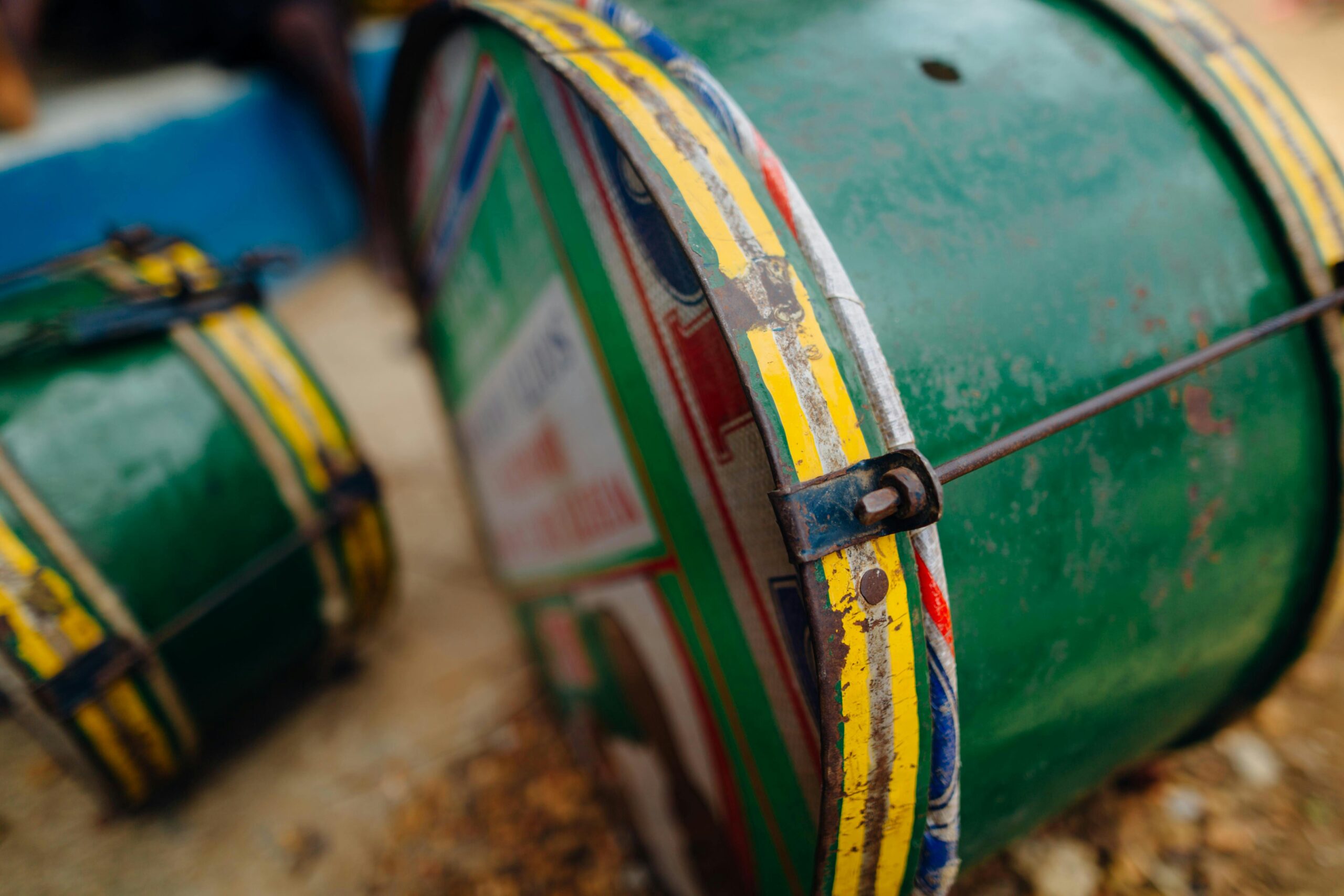 Tambor de lata de tinta: usando uma pele sintética ou couro reaproveitado, artistas criam tambores que produzem sons graves e marcantes.